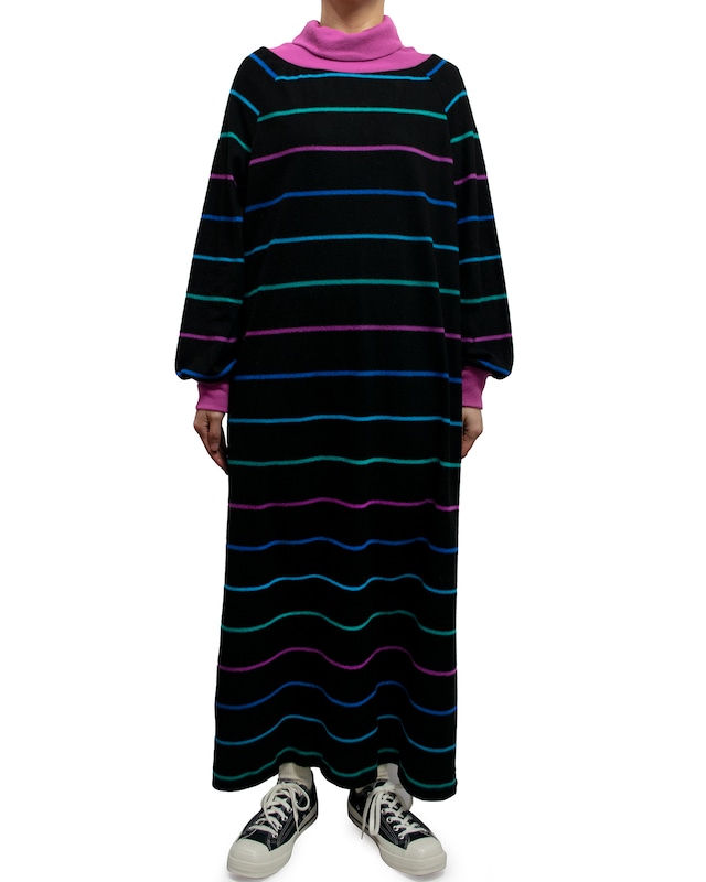 商品説明 黒にカラフルなボーダー柄。リブはピンク。 グッドデザインなワンピース。 Detail 実寸(平置きで計測) 肩幅:ラグランスリーブのため計測不能 身幅:約57センチ 袖丈:ラグランスリーブのため計測不能 ピンクの切り替え部分下から裾:約124センチ 大体の着丈:約119センチ *多少の誤差はご了承くださいませ。 着用モデルの身長は161センチになります。 サイズ表記:M/L 状態:目立つダメージや汚れはありません。 素材:80%ACETATE 20%NYLON (ベロアっぽい生地です) *商品写真は出来る限り実物の色に近付けるようにしてますが、お客様のお使いのモニター設定や照明等により実際の商品と色味が異なる場合が御座います。 *商品はすべてクリーニング済みです。 *古着特有の使用感や、小さなほつれや薄いしみがある場合が御座います。古着ということを理解頂いた上で購入をお願い致します。 *返品・交換は基本的に受け付けてません。 *こちらの商品は店頭でも販売してるため行き違いでSOLD OUTとなってる場合が御座います。予めご了承くださいませ。