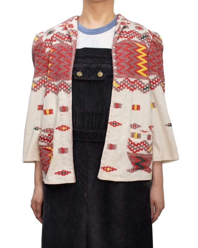 商品説明 Vintageならではの風合い。 パフスリーブでコンパクトな作り。 手刺繍のデザインジャケット。 Detail 実寸(平置きで計測) 肩幅:約38センチ 身幅:約52センチ 袖丈:約48センチ 着丈:約58センチ (襟下より裾までの長さ) *多少の誤差はご了承くださいませ。 着用モデルの身長は161センチになります。 サイズ表記:表記なし 状態:目立つダメージや汚れはありません。 素材:表記なし(おそらくコットン) *商品写真は出来る限り実物の色に近付けるようにしてますが、お客様のお使いのモニター設定や照明等により実際の商品と色味が異なる場合が御座います。 *商品はすべてクリーニング済みです。 *古着特有の使用感や、小さなほつれや薄いしみがある場合が御座います。古着ということを理解頂いた上で購入をお願い致します。 *返品・交換は基本的に受け付けてません。 *こちらの商品は店頭でも販売してるため行き違いでSOLD OUTとなってる場合が御座います。予めご了承くださいませ。