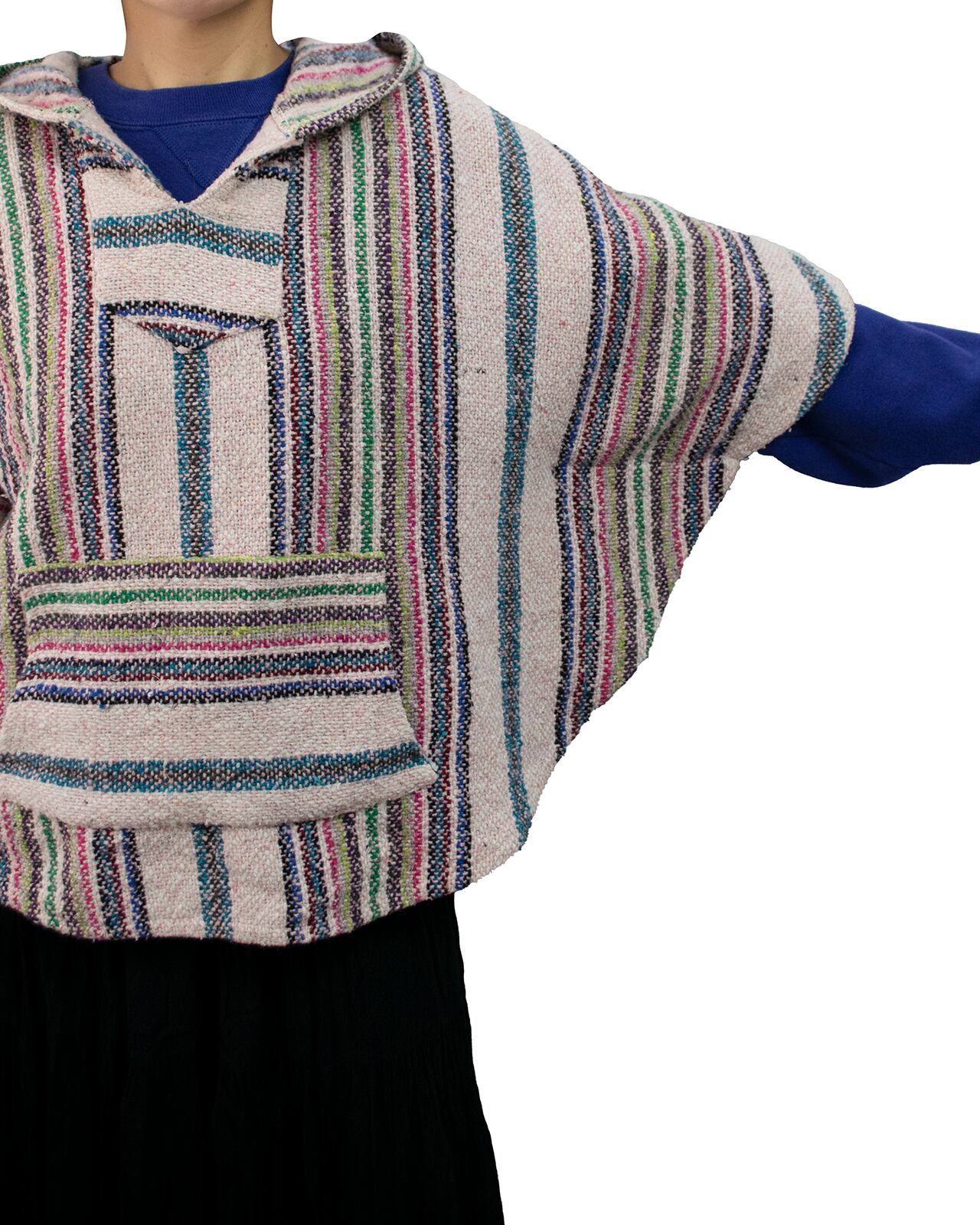 淡いピンクベースのメキシカンパーカーと思いきや通常の形ではなくポンチョ型になった珍しいデザインの1枚。