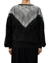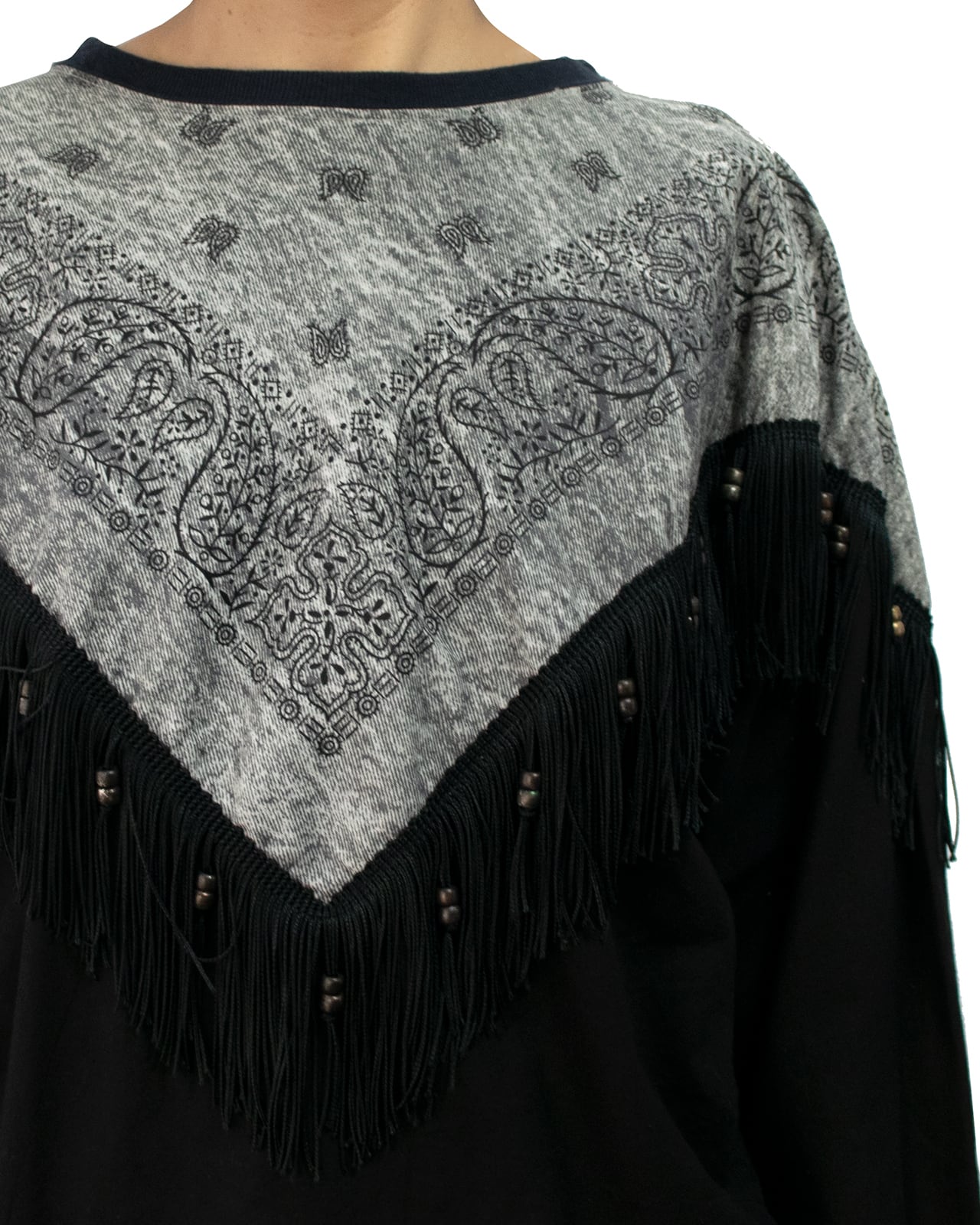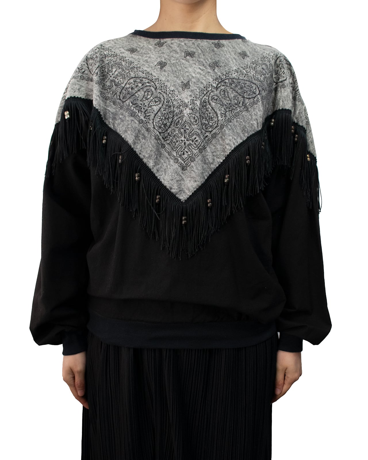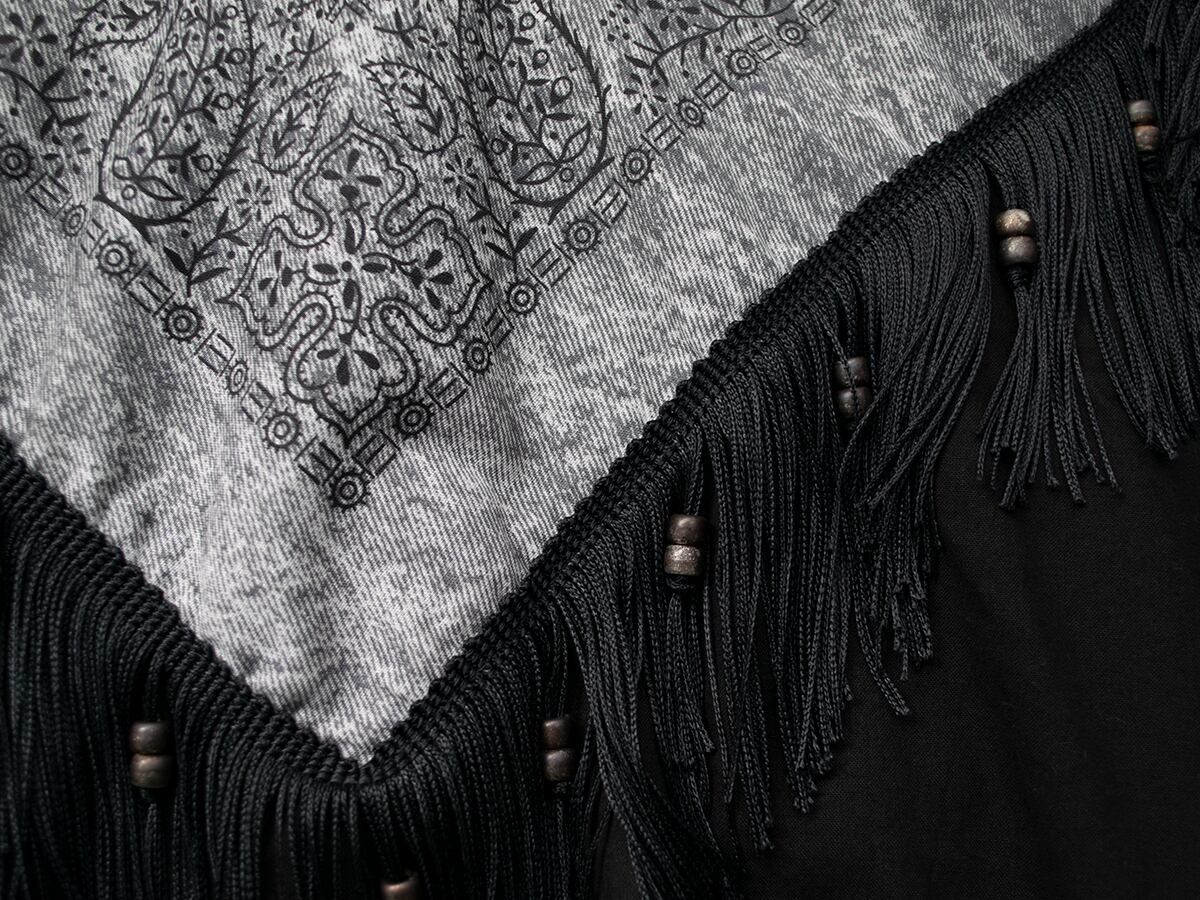 ブラックデニム風のバンダナ切り替えとフリンジデザイン。