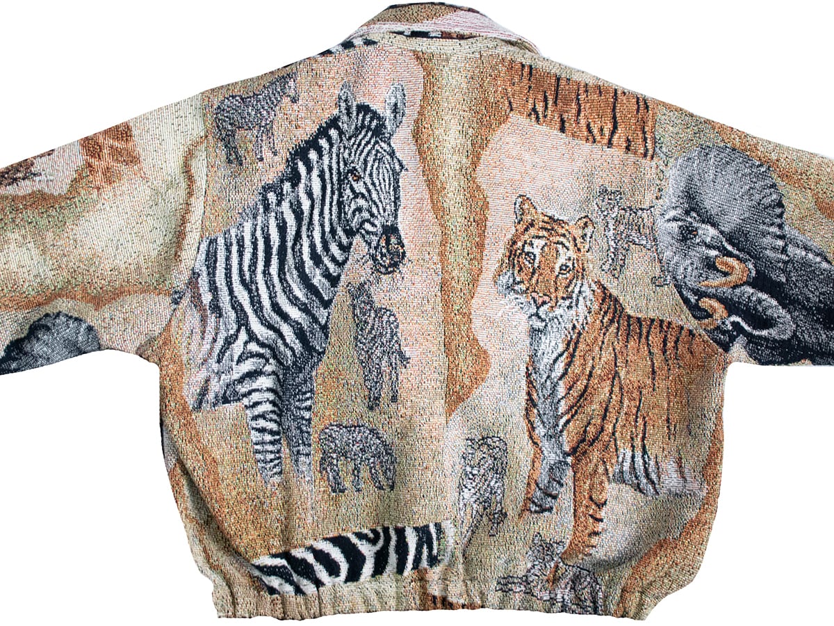 ライオンや馬やシマウマ、アニマル総柄の織りのジャケット。