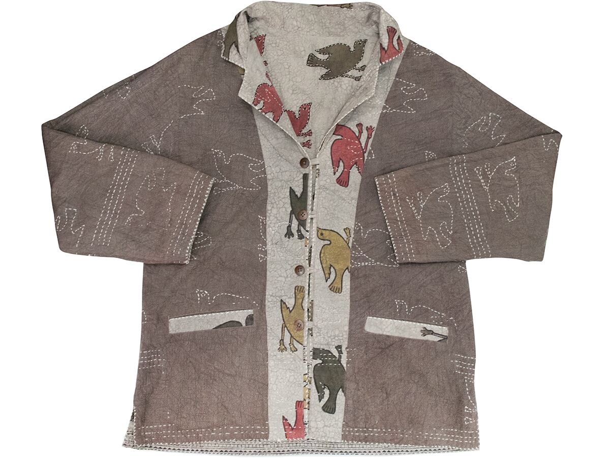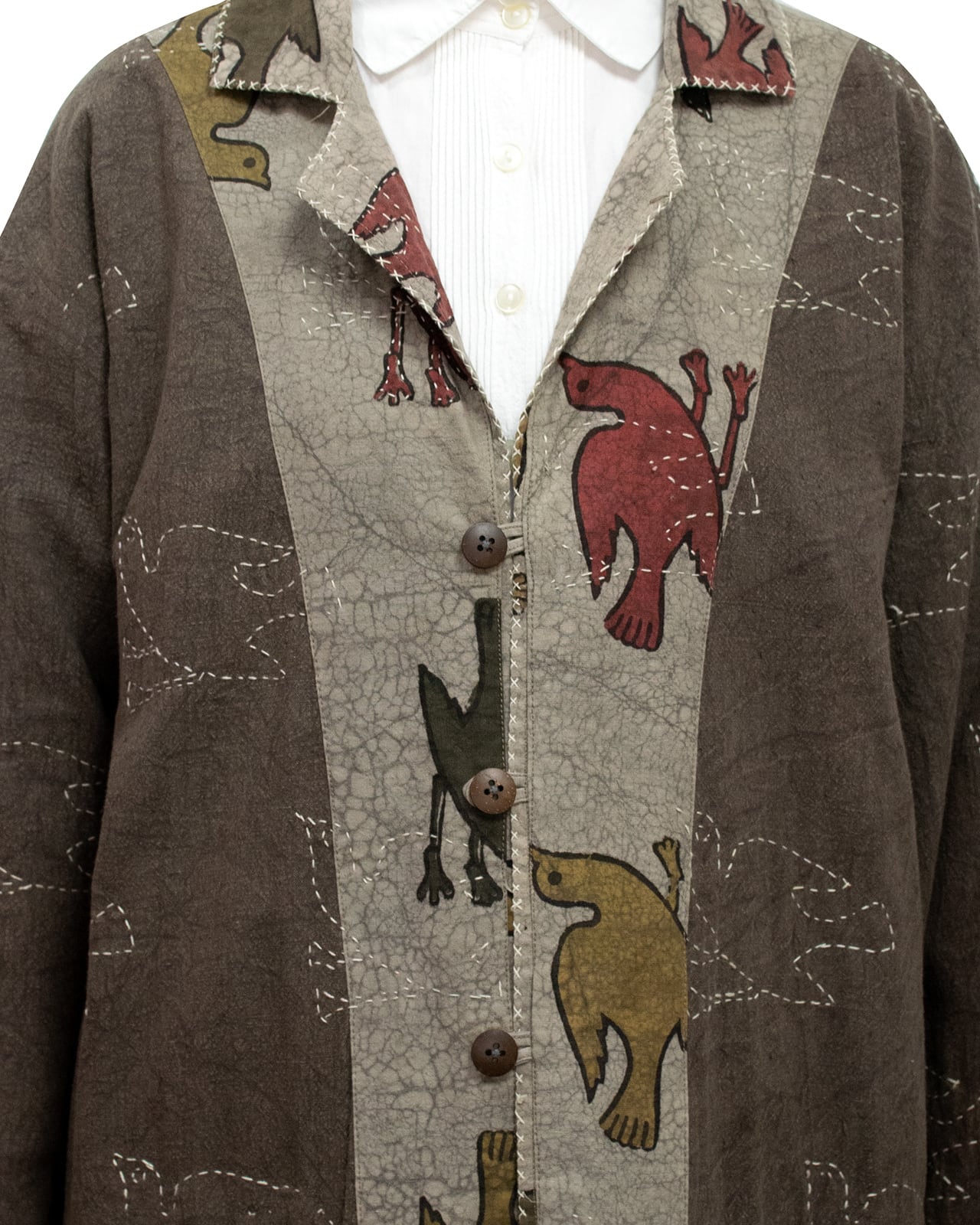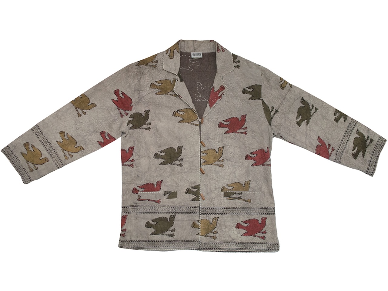 ムラ染めの生地に染色で鳥を周りを刺し子のようなステッチで装飾。