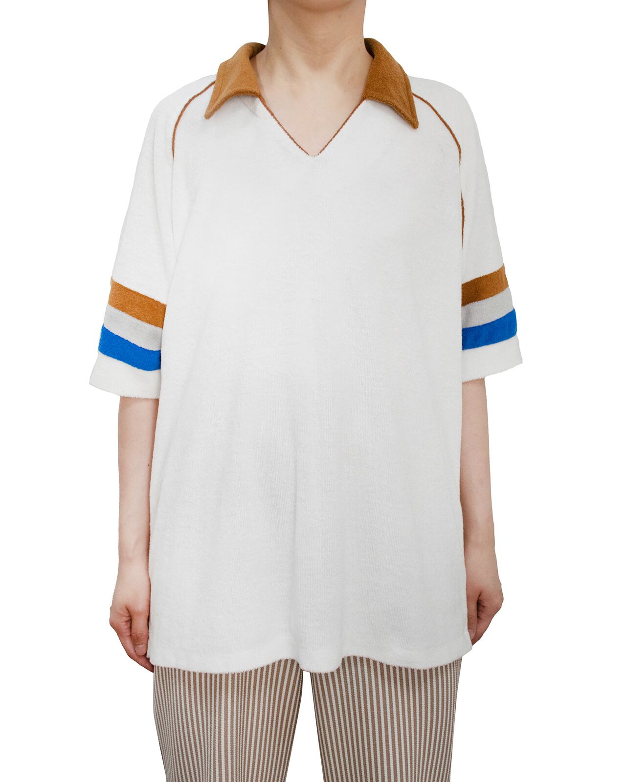 襟と袖の切り替え部分がブラウン、袖口にはブラウン、グレー、ブルーのライン。