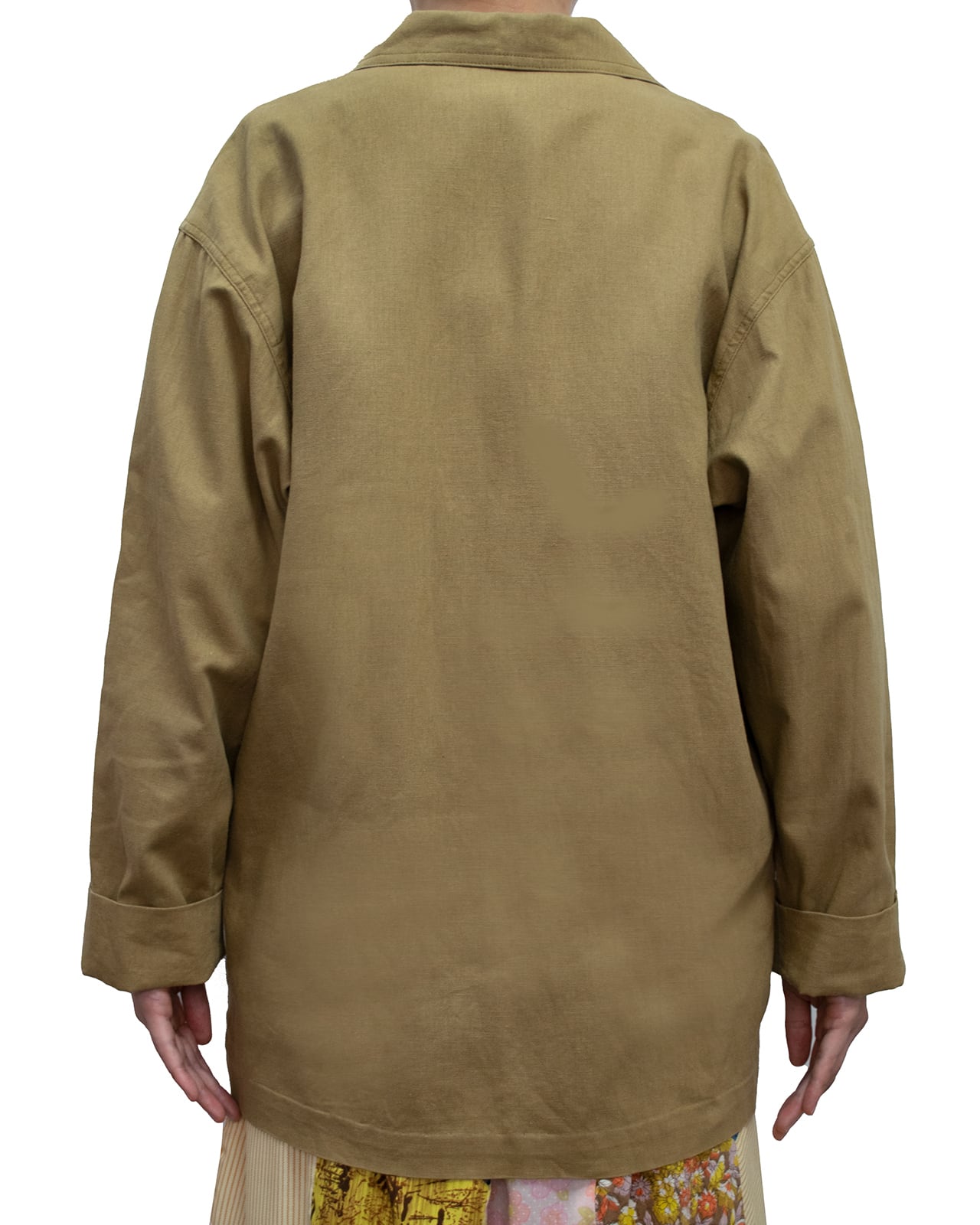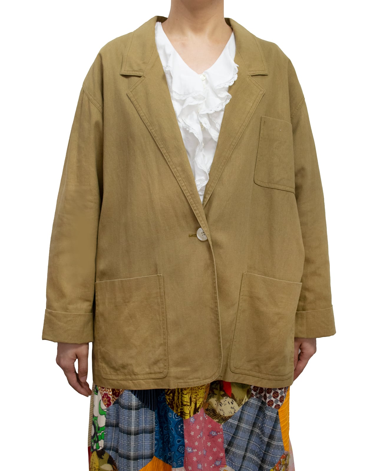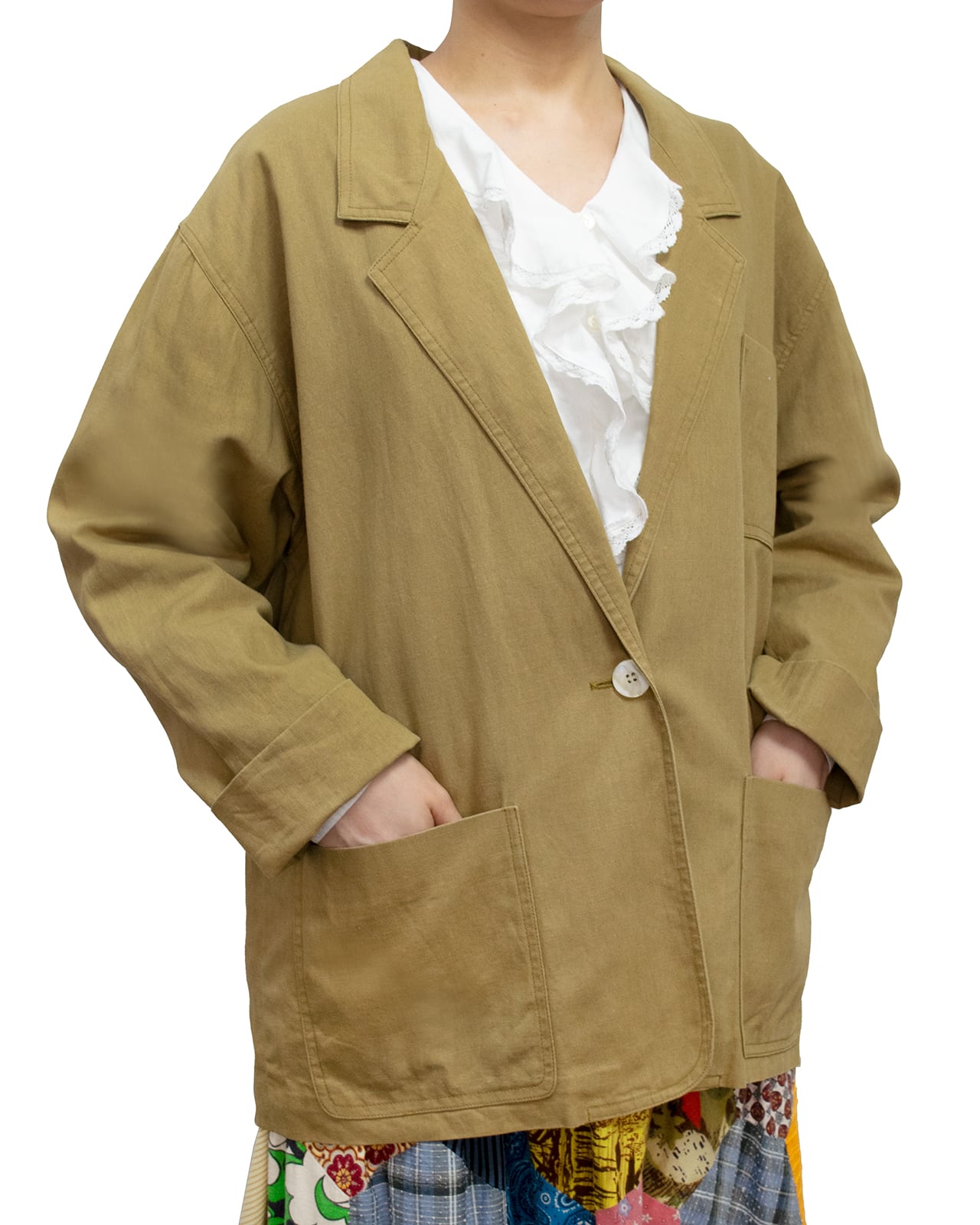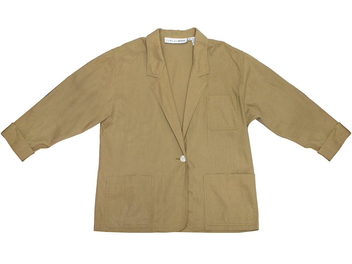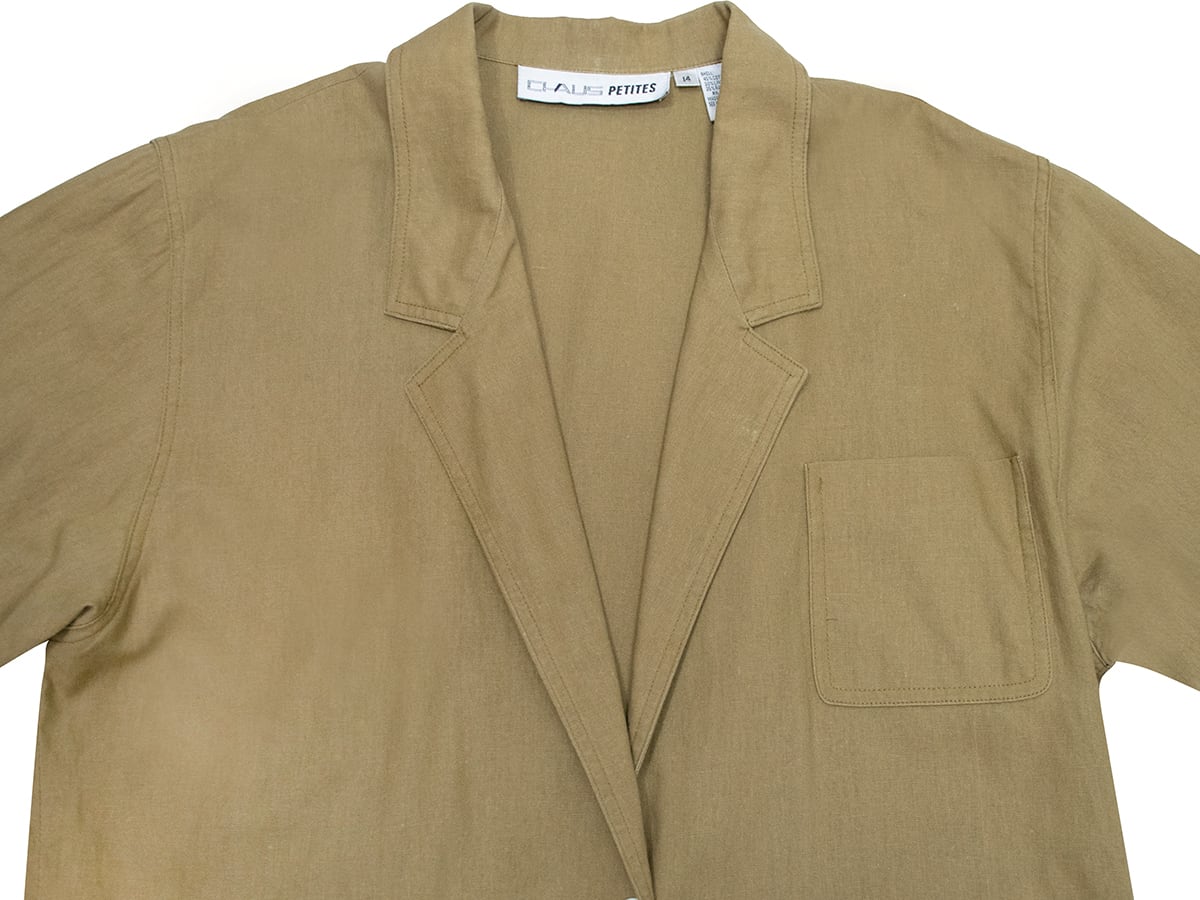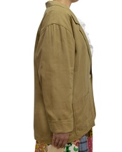 肩パッドの入ってないカーキのテーラードジャケット。