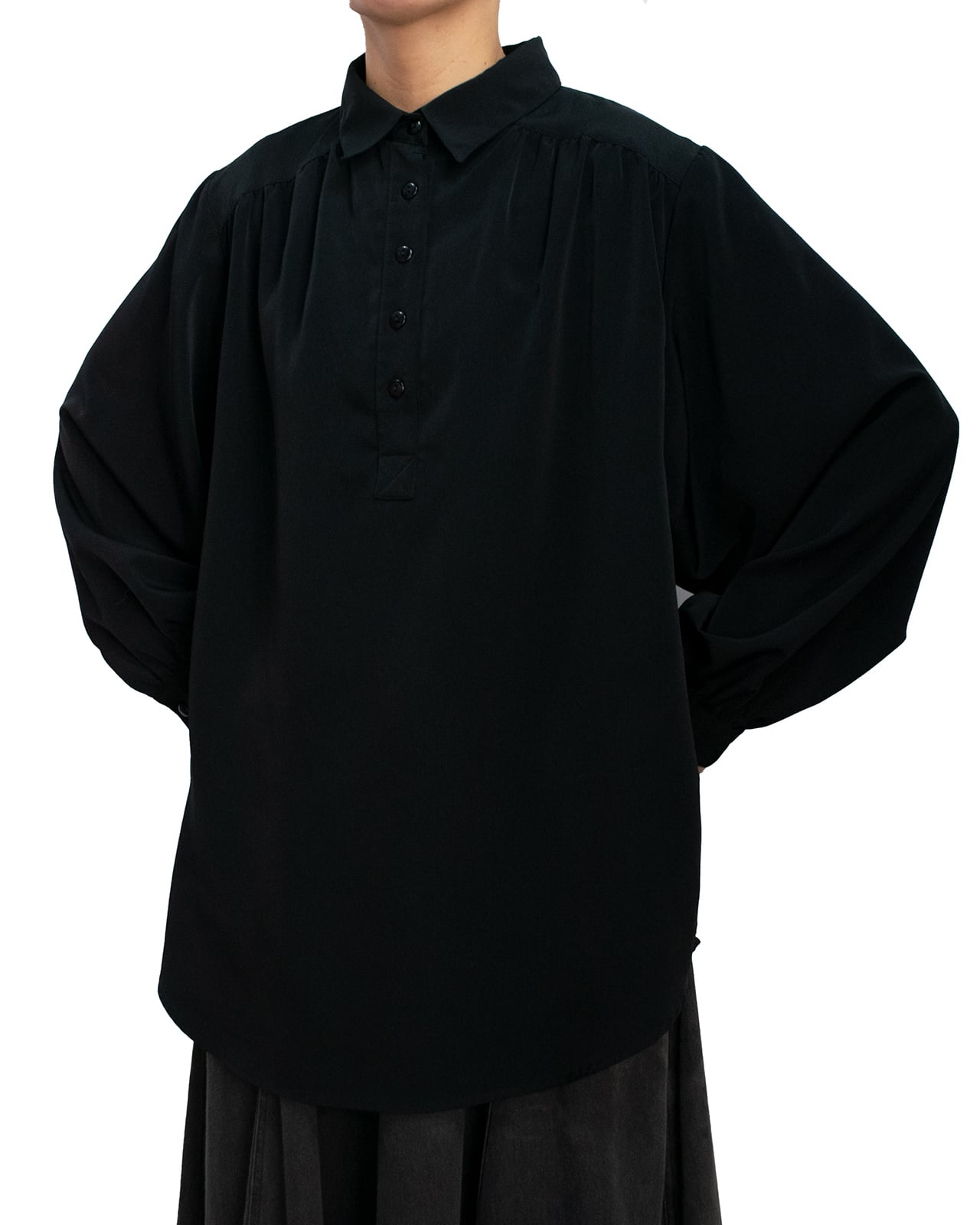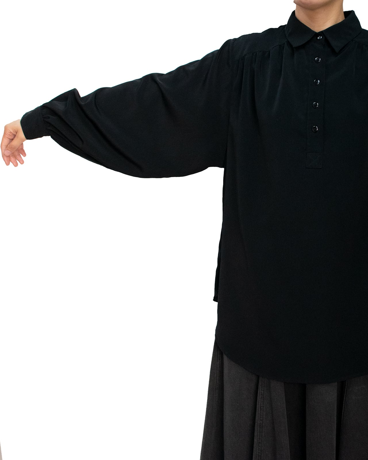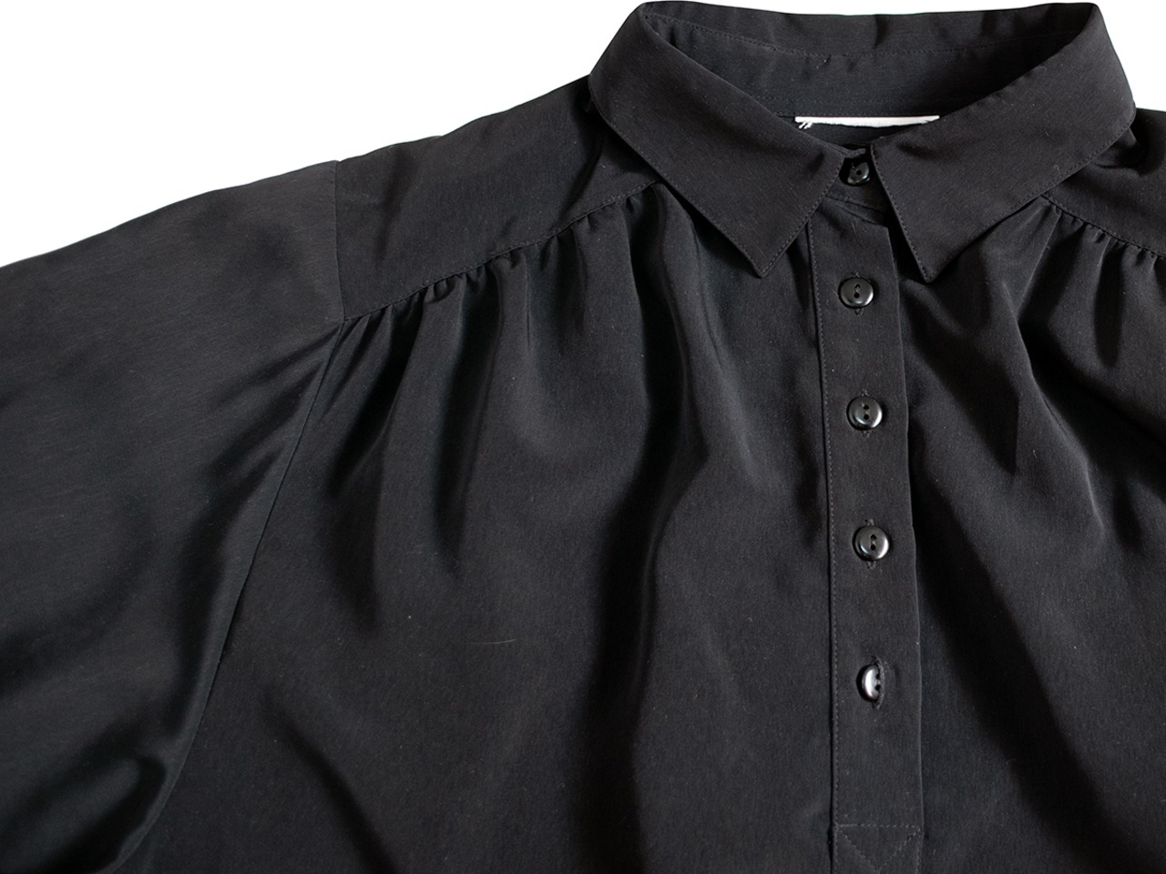 とろみのある生地、ギャザーの入ったワイドな作りでドレープ、ボリュームのある袖、襟の形も完璧でグッドデザインな黒無地のプルオーバーなブラウス。