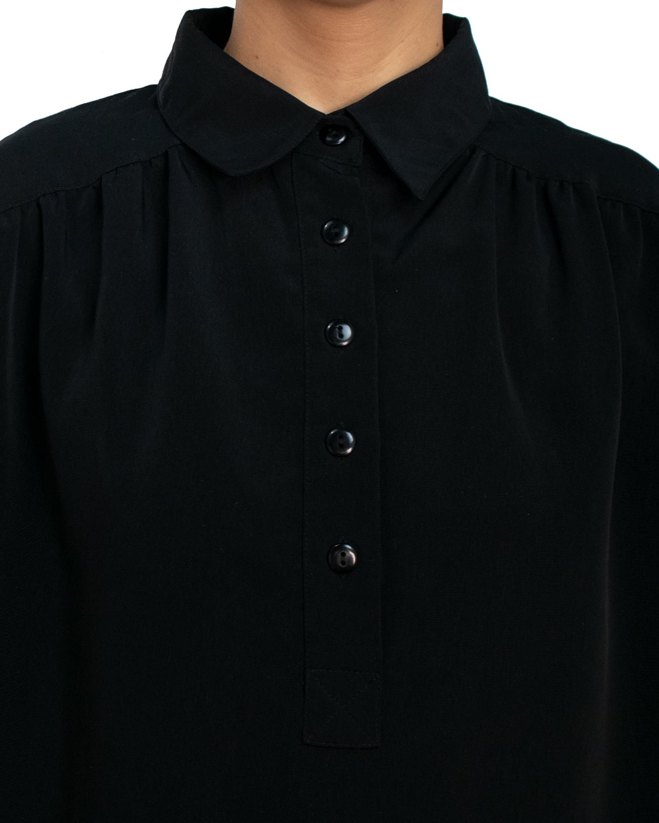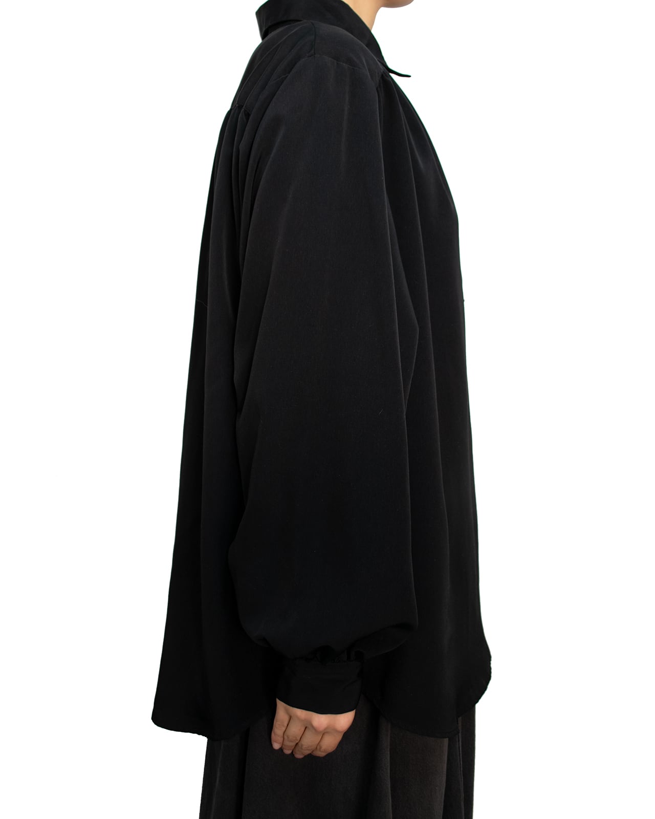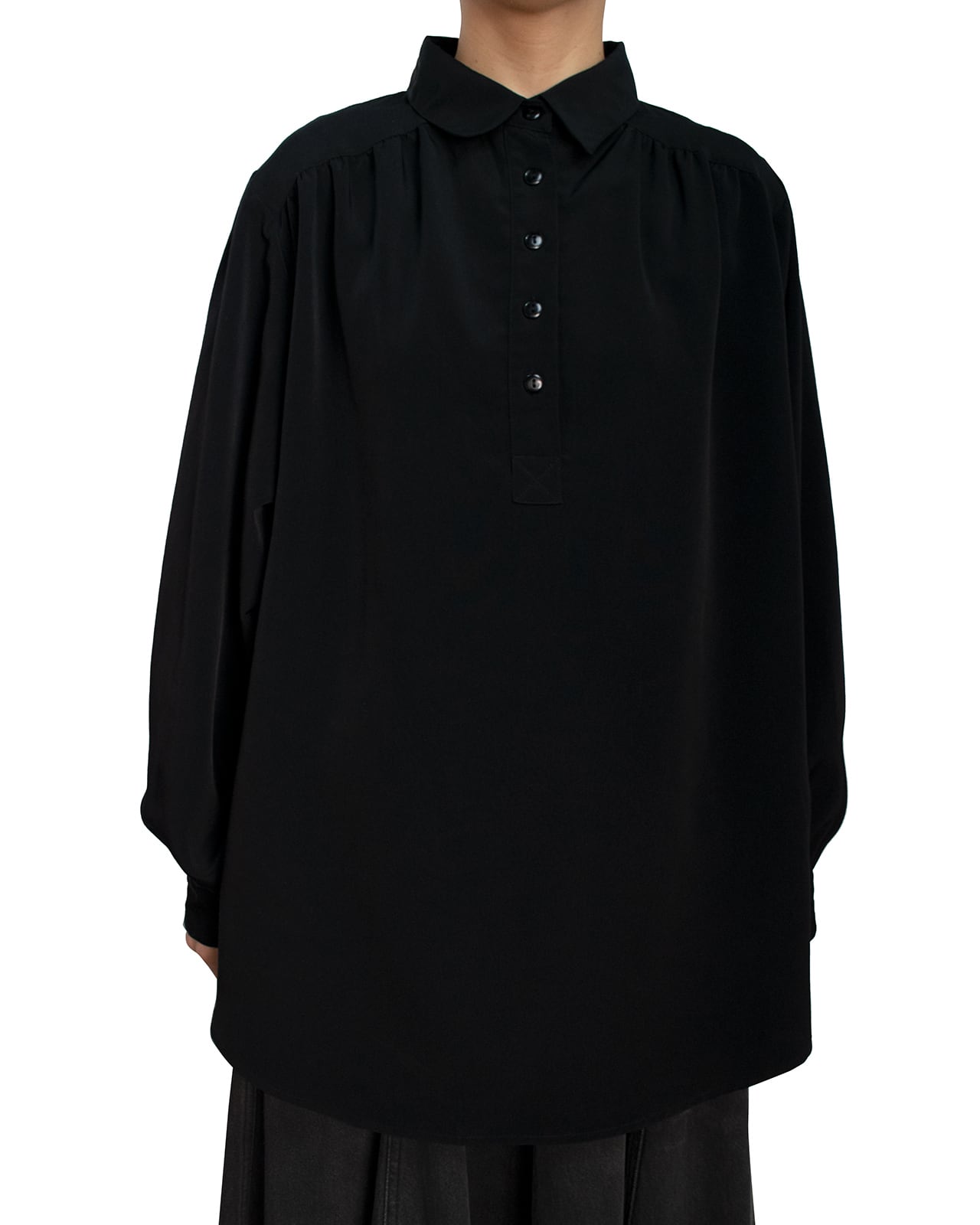 とろみのある生地、ギャザーの入ったワイドな作りでドレープ、ボリュームのある袖、襟の形も完璧でグッドデザインな黒無地のプルオーバーなブラウス。