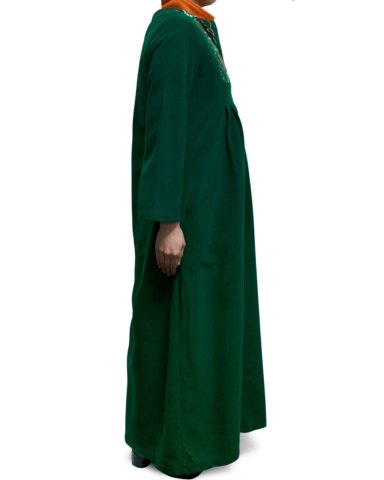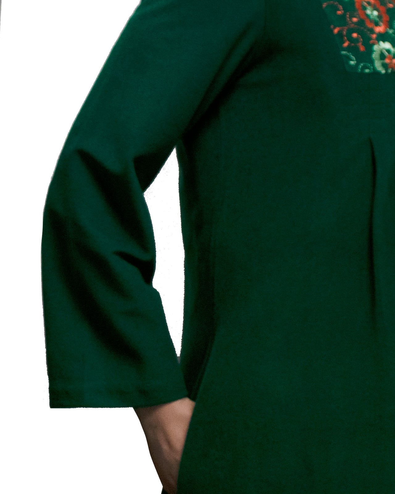 フェルトみたいなグリーンの生地にお花の刺繍。