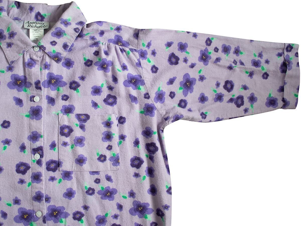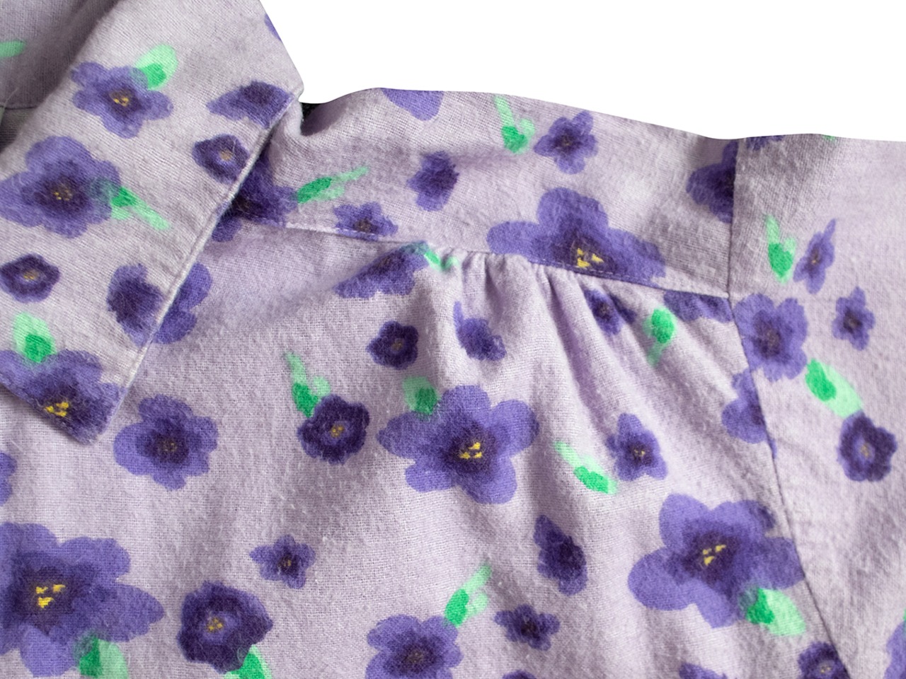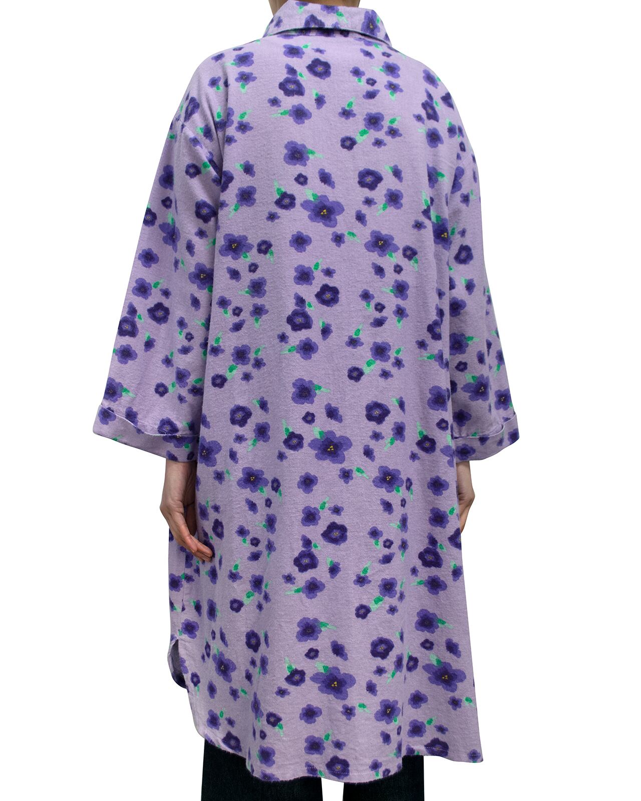 淡いラベンダーカラーの花柄なフランネルのテキスタイル。