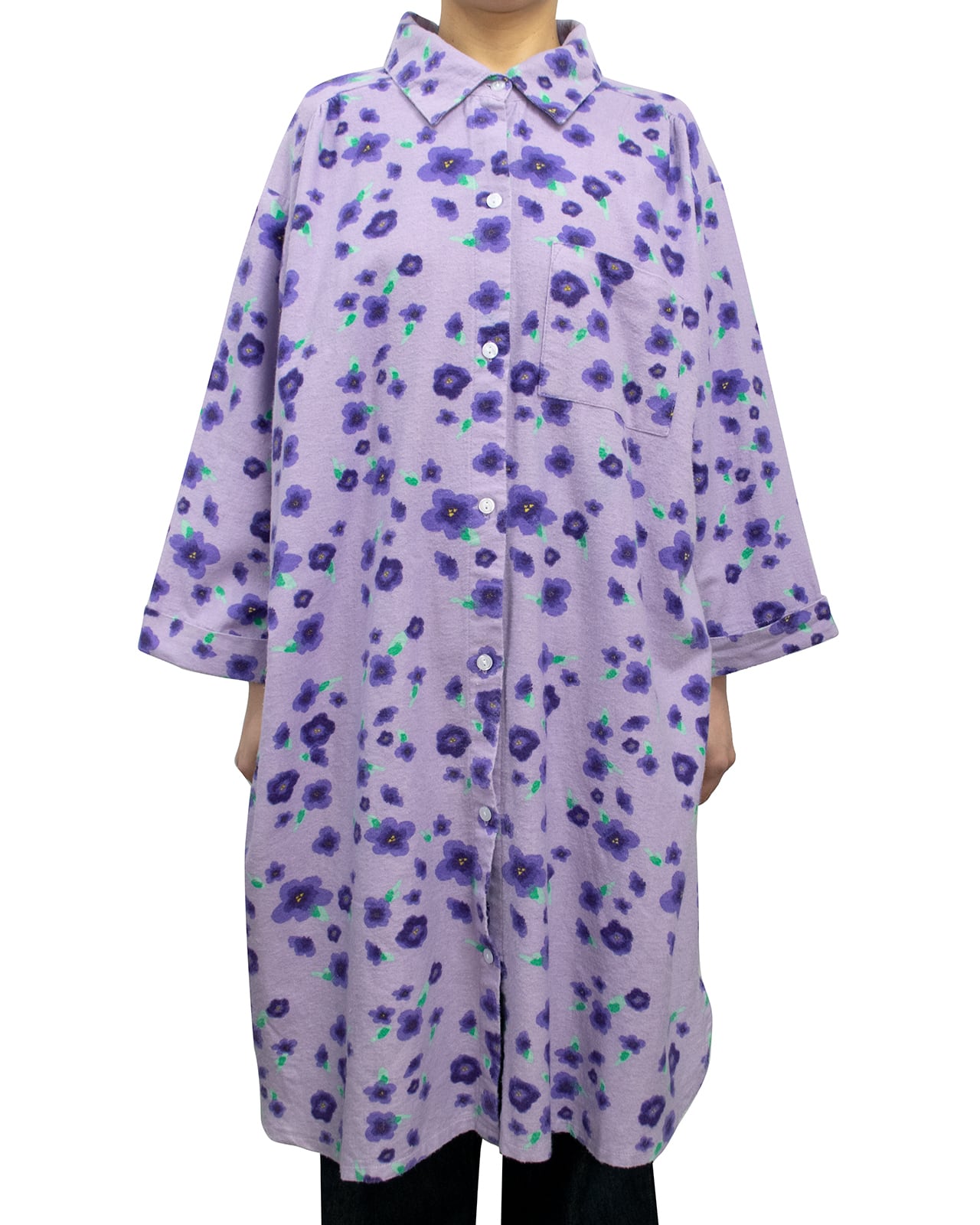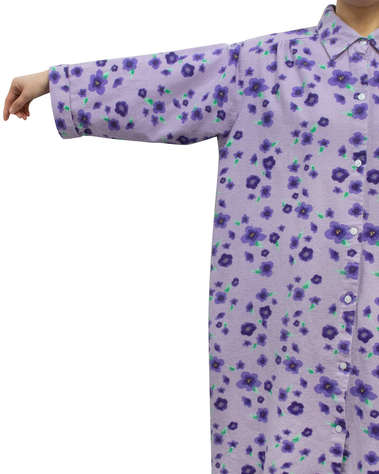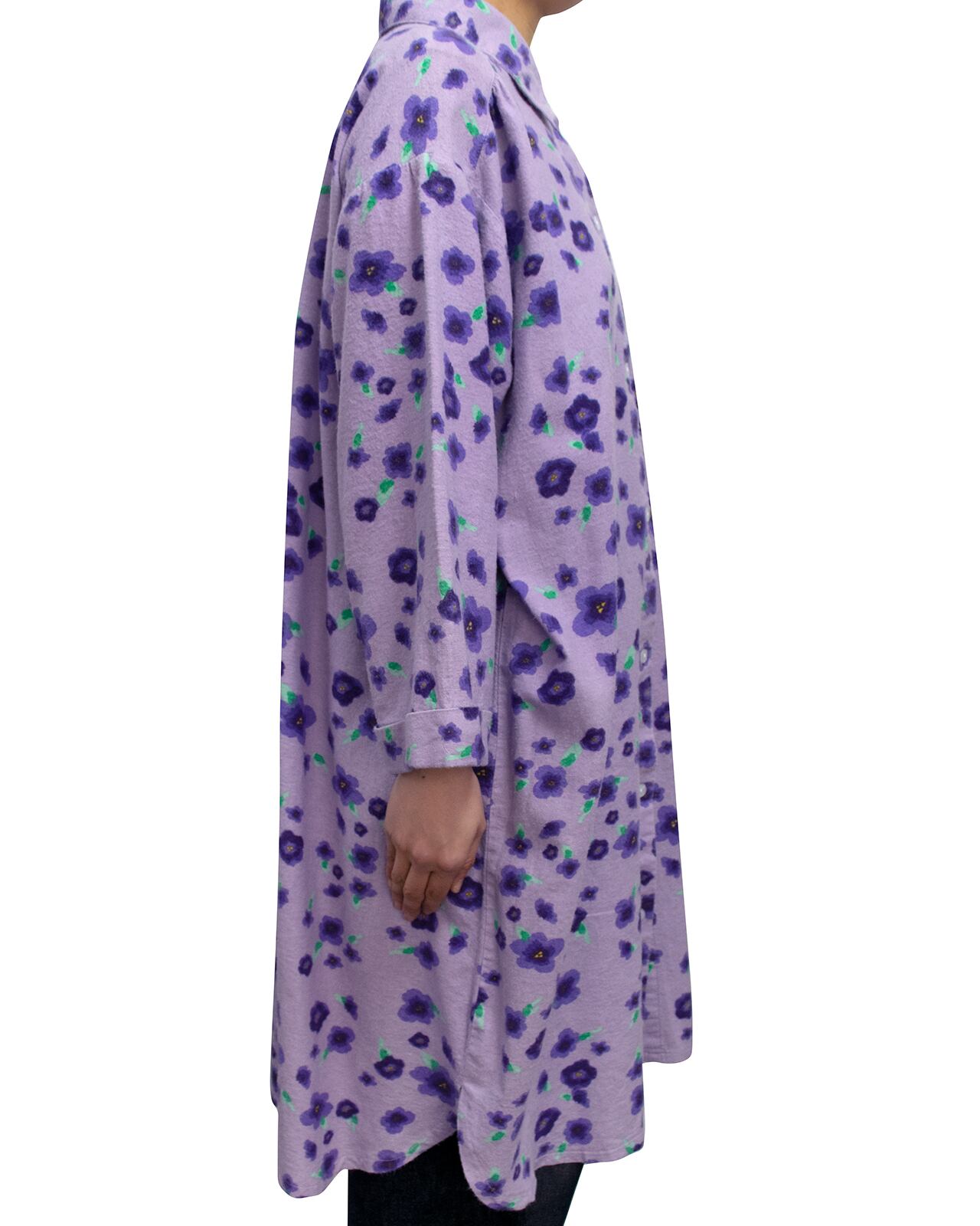 淡いラベンダーカラーの花柄なフランネルのテキスタイル。