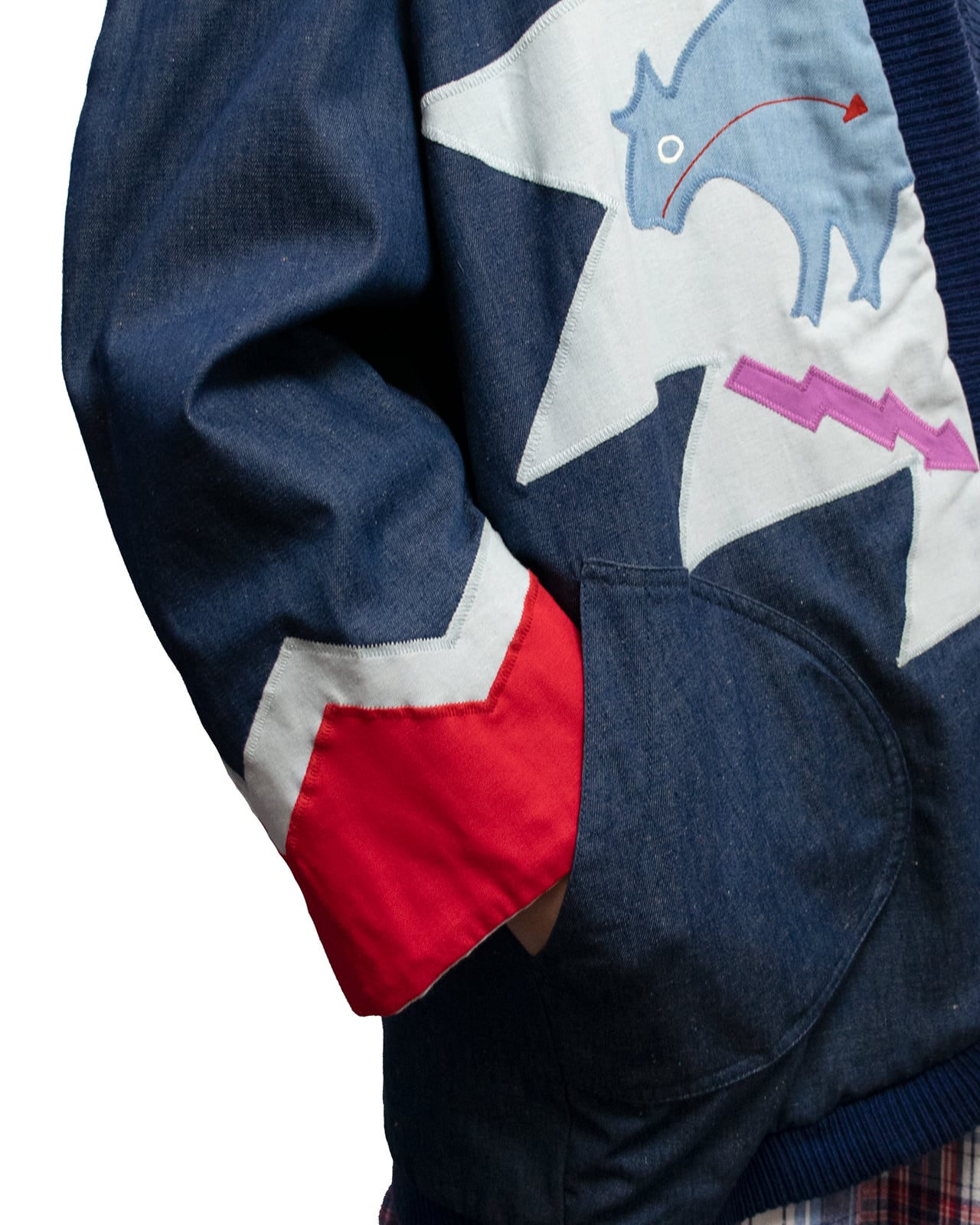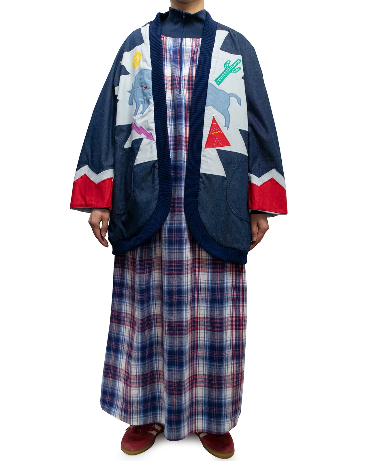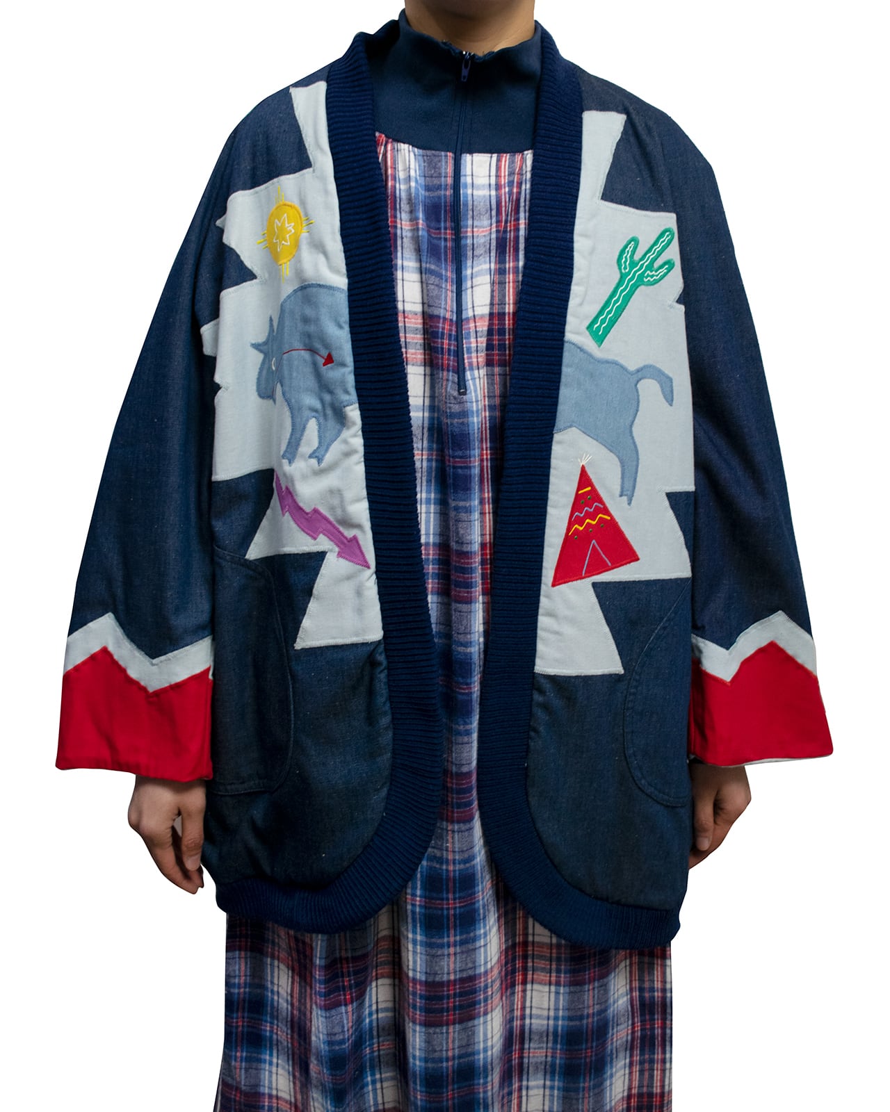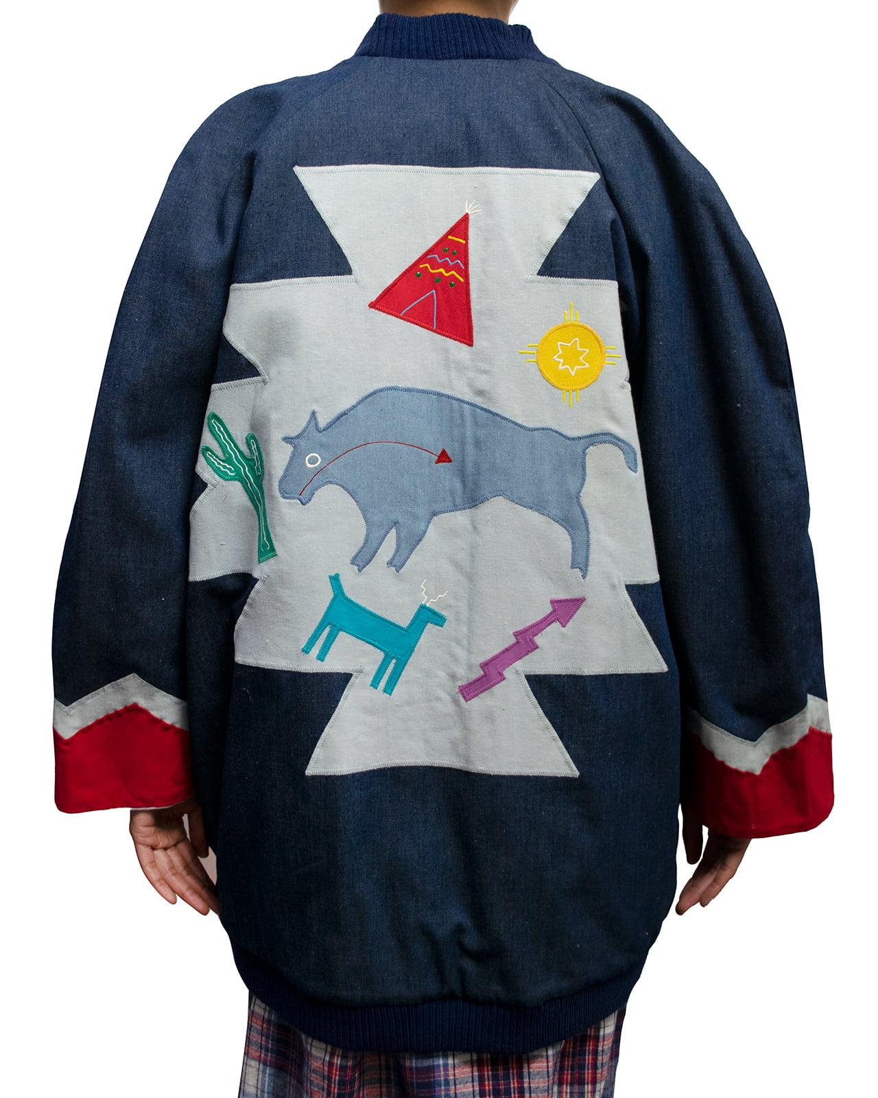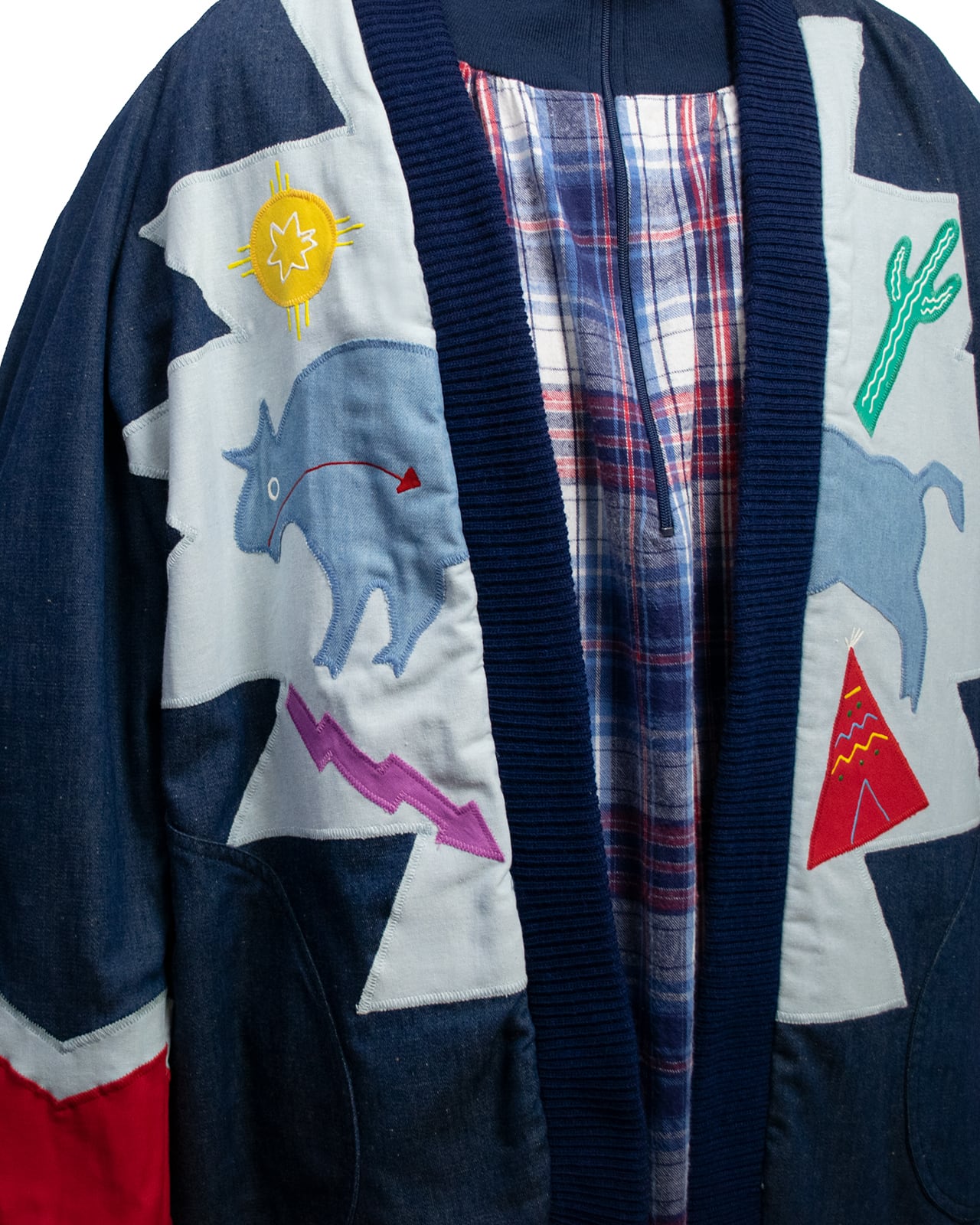 リバーシブルで片側はシンプル、反対側はバッファローやサボテンのモチーフなパッチワーク。