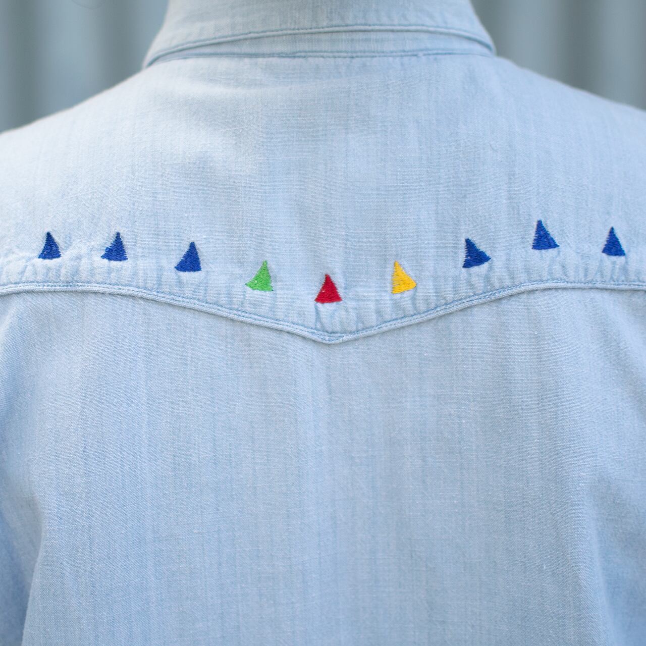 ライトブルーの薄手のコットンのシャツで胸元にカラフルな三角の刺繍とカラフルなビーズのフリンジ。