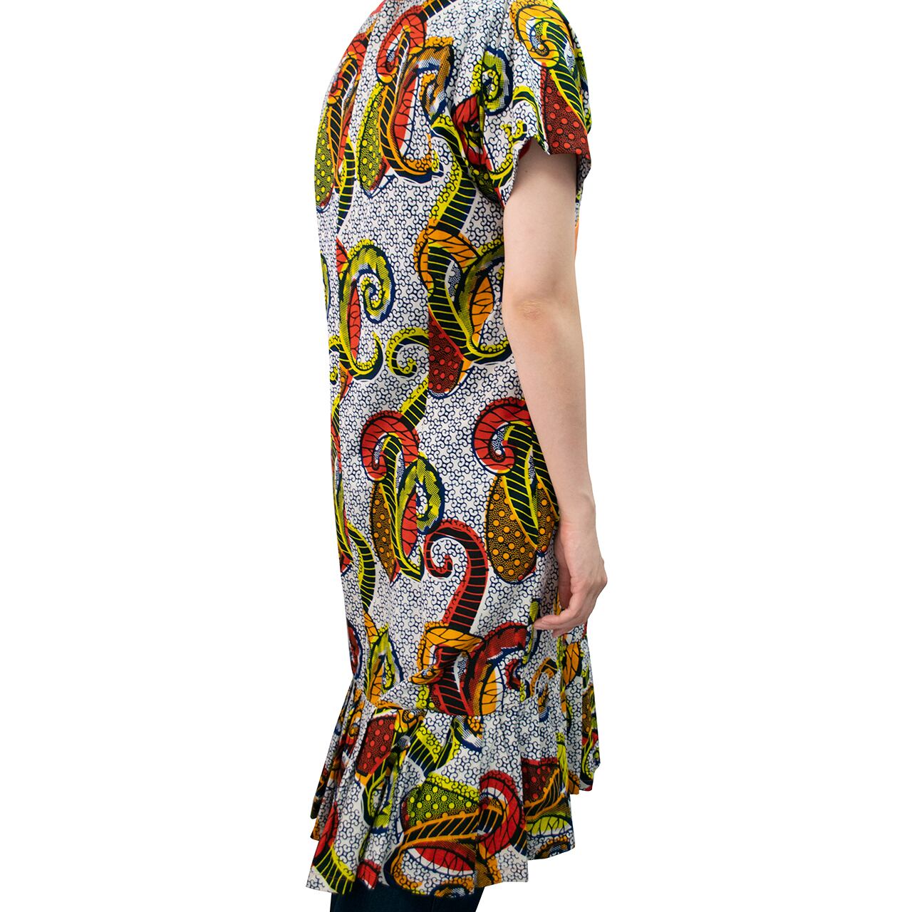 カシュクールっぽいデザインでオレンジの光沢のある生地が切り替えになったアフリカンのワンピース。
