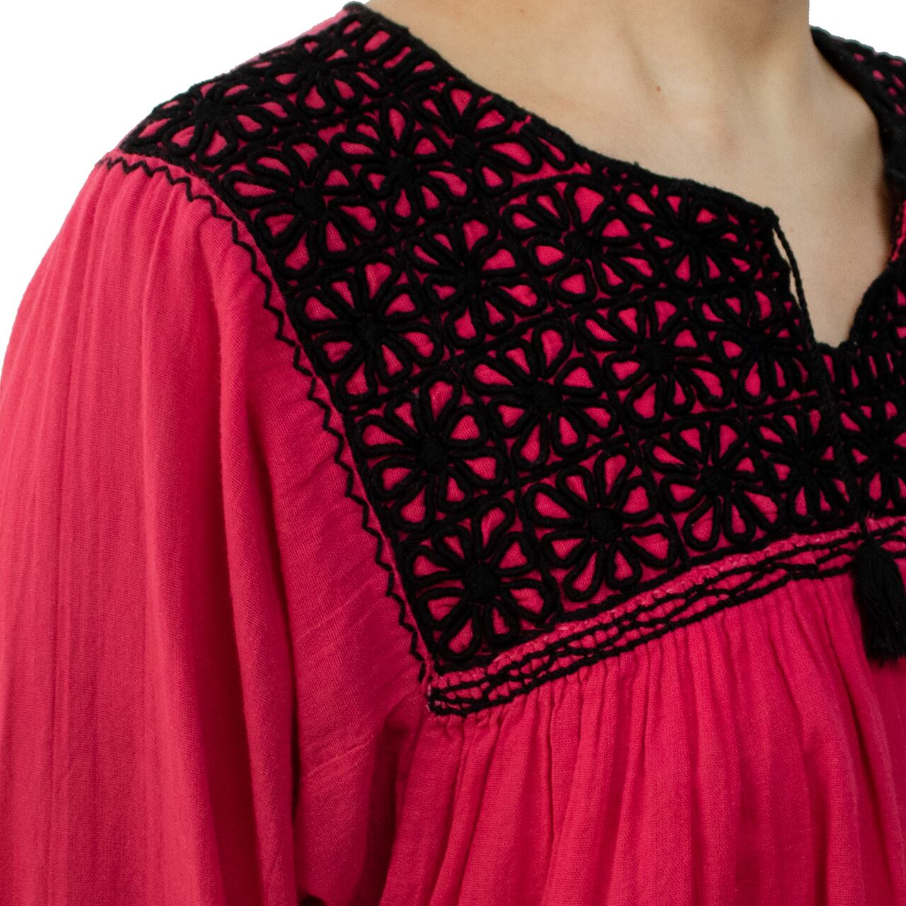 マゼンタにブラックの刺繍っていう珍しい都会的な配色のチュニック。
